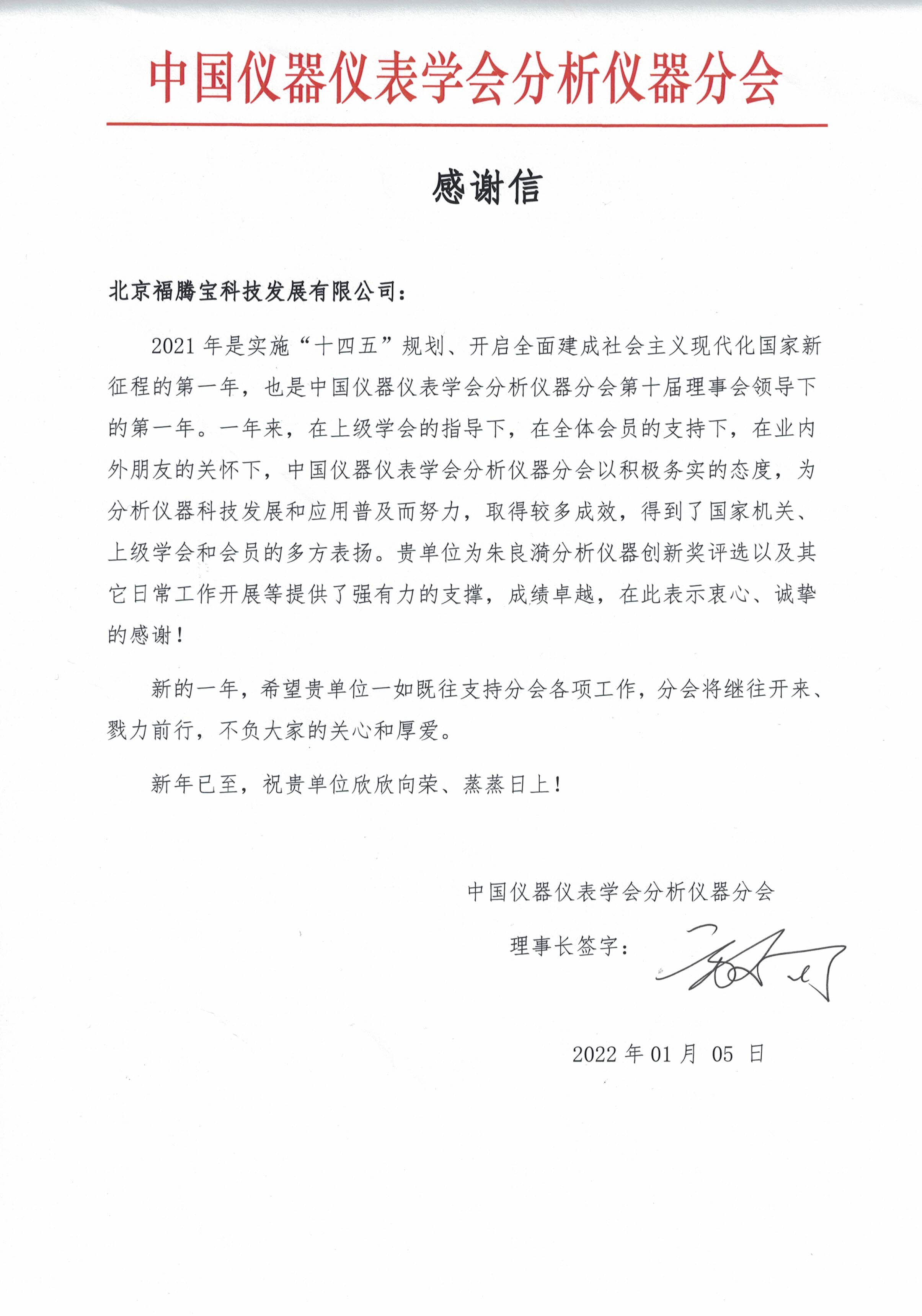 中国仪器仪表学会分析仪器分会致北京福腾宝科技发展有限公司的感谢信